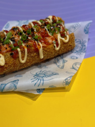Italiaans broodje met gebakken scholfilet, cocktail/sriracha, rode ui, zeekraalchips en gesmolten kaas