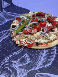 Heerlijke verse pizzabodem met Tonijn, tomaat, asnjovis, olijf en mozzarella