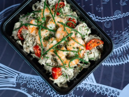 Verse tagliatelle in pesto-roomsaus met emmenthaler en gemarineerde knoflook-gamba's