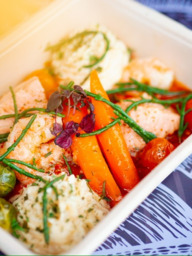 Huisgemaakte puree met een Italliaanse tomatensaus met courgette, wortel en ansjovis, seizoensgroenten en gegrilde Zalm